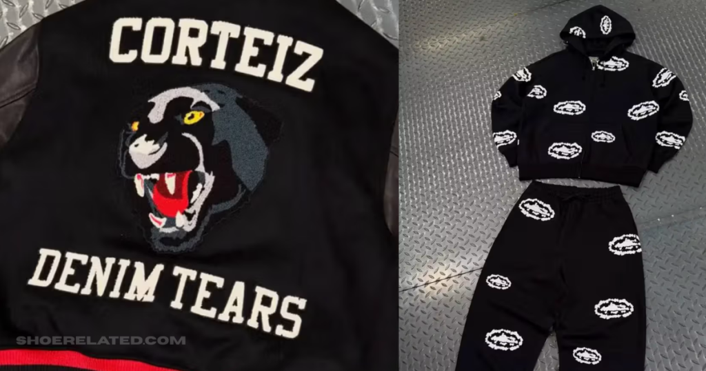- Varsity jackets featuring a newly designed hybrid Corteiz x Denim Tears logo