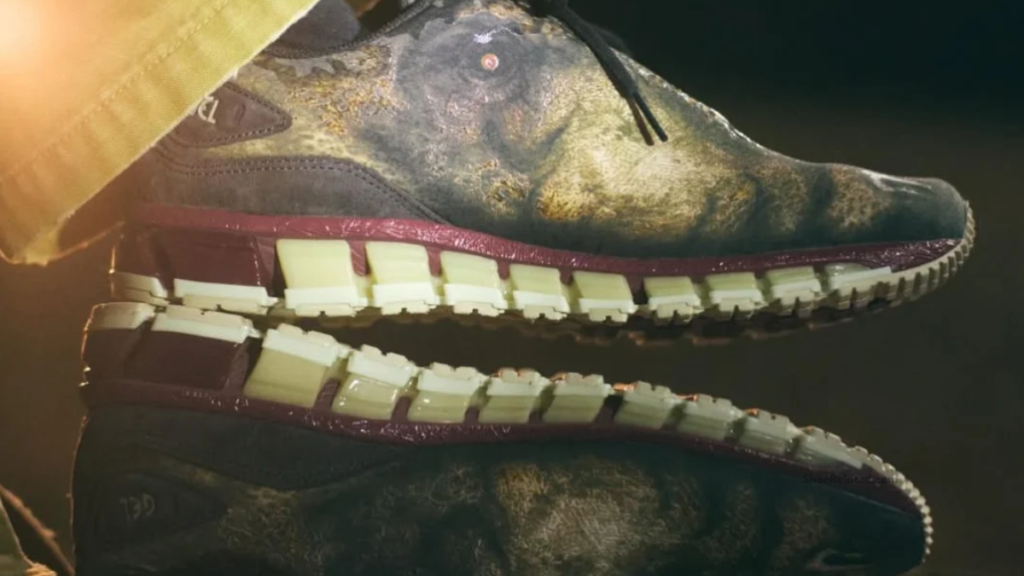 The leather upper features a high-resolution T-Rex graphic, complete with piercing eyes stretching across the sides and textured reptilian detailing throughout. This isn’t a subtle reference—it’s an intentional, statement-making design that immediately separates itself from other ASICS collaborations.